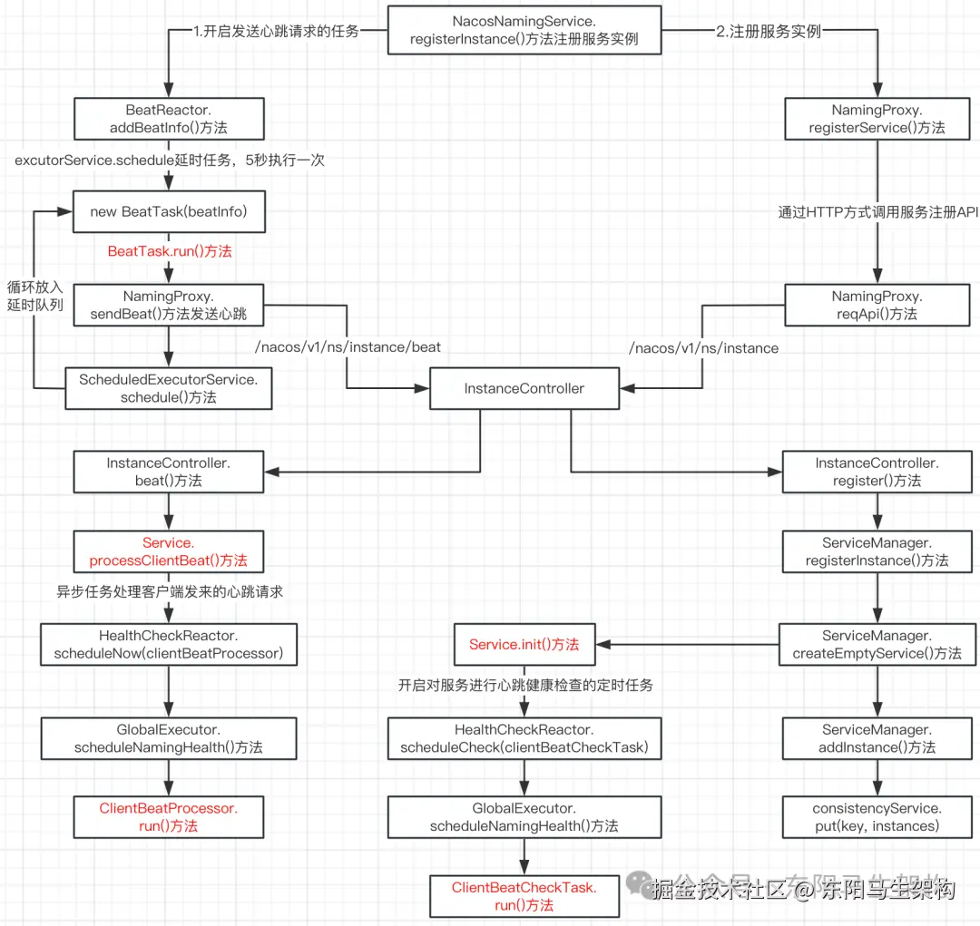 nacos-discovery利用了Spring的事件监听机制,在Spring容器启动时的调用Nacos服务端提供的服务实例注册接口。在调用服务实例注册接口时,客户端会开启一个异步任务来做发送心跳。