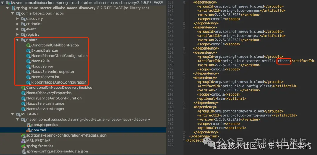 在nacos-discovery的pom.xml中,可以看到它引入了Ribbon依赖:
