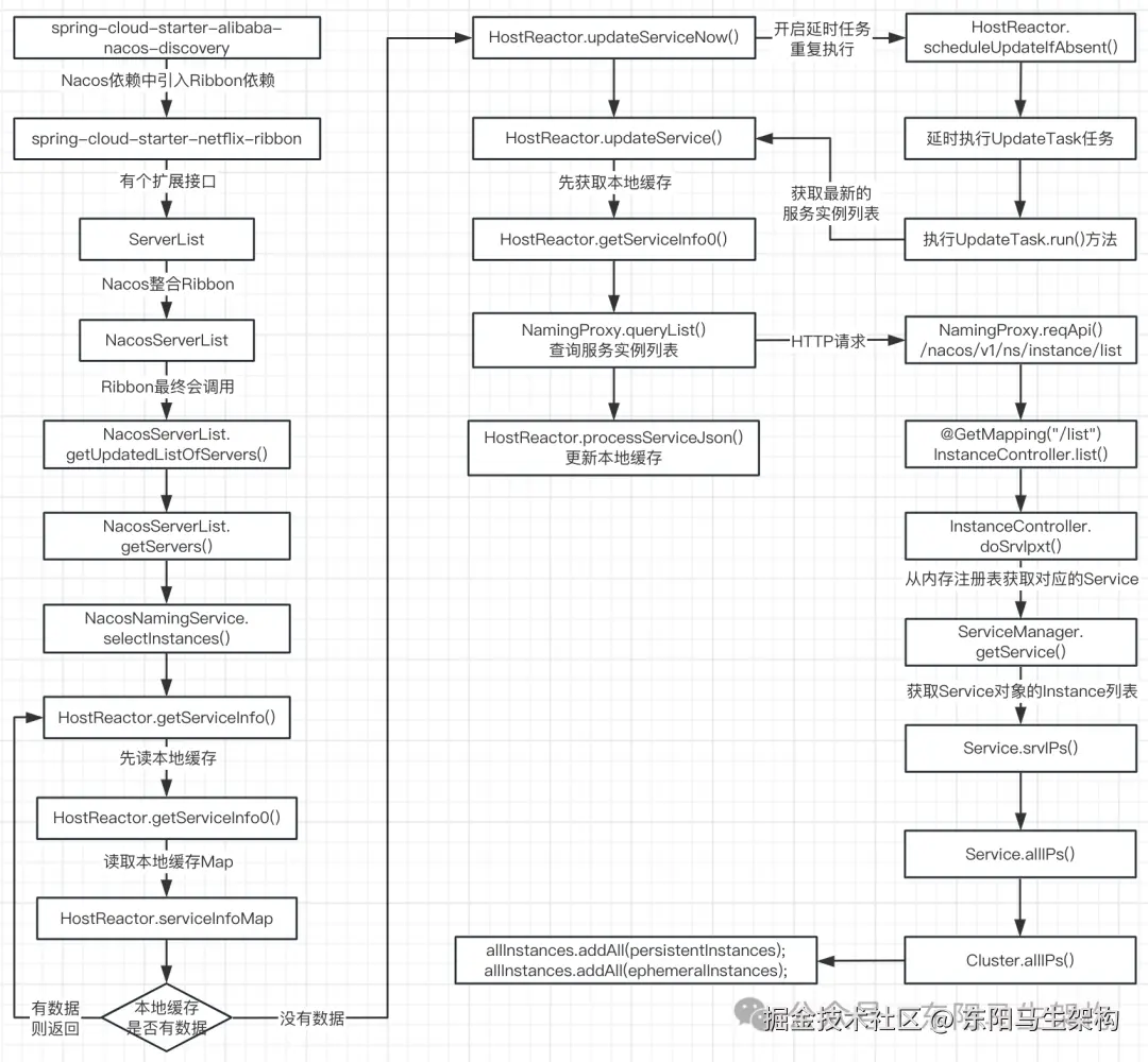 在nacos-client的NacosNamingService的selectInstances()方法中:首先会调用HostReactor的getServiceInfo()方法获取服务实例列表,然后调用HostReactor的getServiceInfo0()方法尝试从本地缓存获取,接着调用HostReactor的updateServiceNow()方法查询并更新缓存,也就是调用HostReactor的updateService()方法查询并更新缓存。即先调用NamingProxy的queryList()方法来查询服务端的服务实例列表,再调用HostReactor的processServiceJson()方法更新本地缓存。最后调用HostReactor的scheduleUpdateIfAbsent()方法提交同步缓存任务。