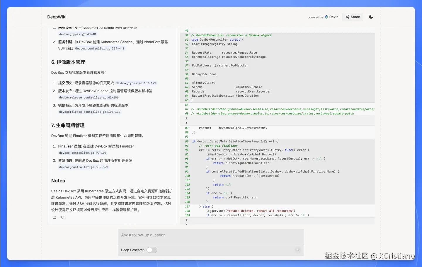 我拿 Sealos的 GitHub 仓库 试验了一下,确实有点惊艳到我了,整个页面层次清晰,还有很多可视化架构图(Sealos 项目本身并没有提供),每个章节都有相关的资料来源,非常方便查阅。