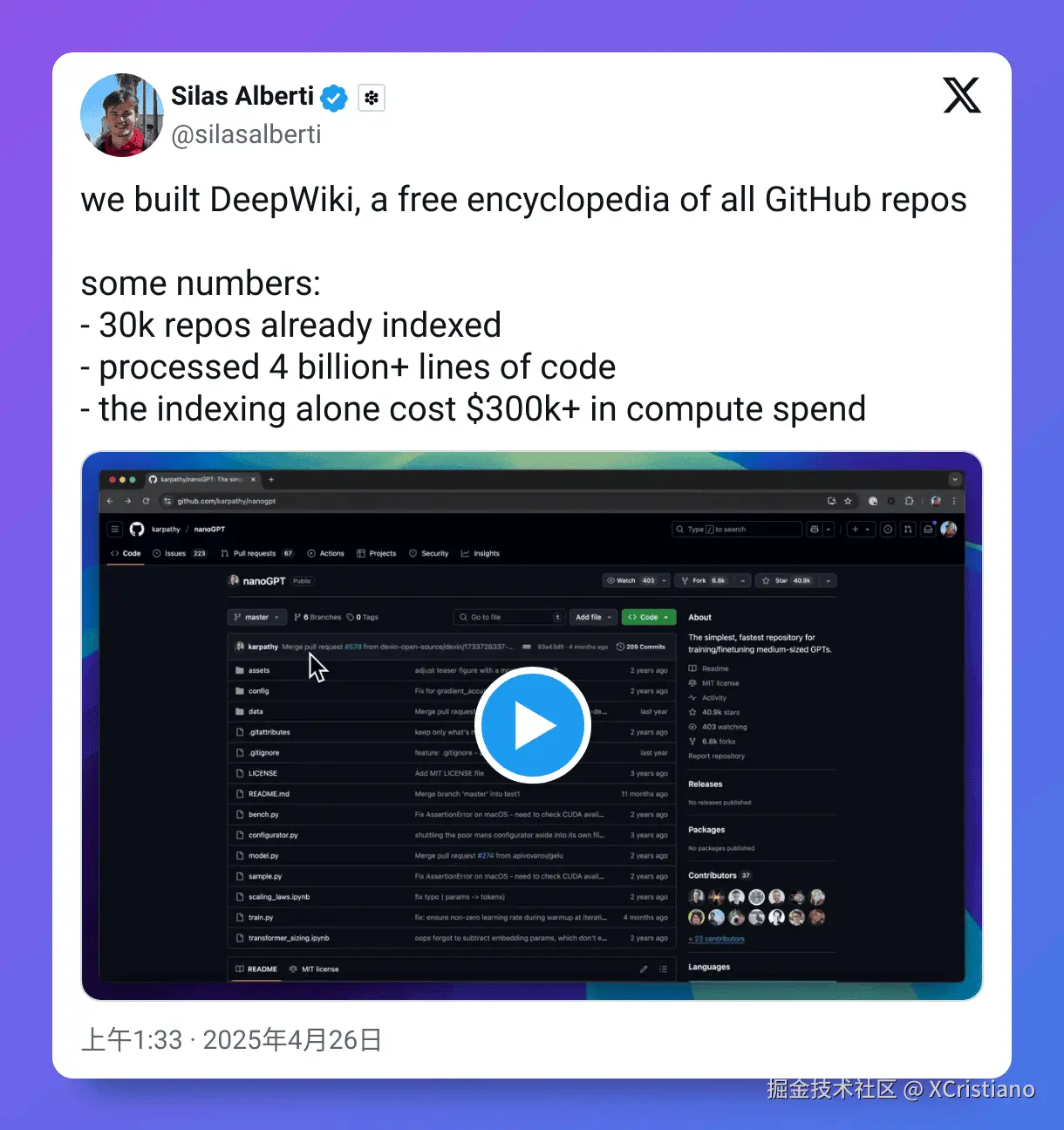 • 已经索引了大约 3 万个 GitHub 仓库(还在持续增加中)。 • 分析处理了超过 40 亿行 代码。 • 光是索引这些代码,据说计算成本就砸了超过 30 万美元。 • 总共处理的 Token 数量超过了 1000 亿个!