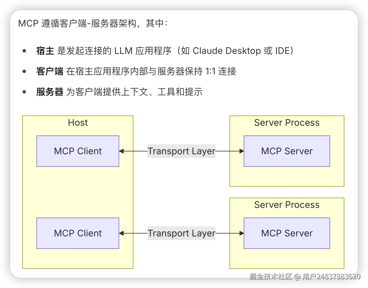 MCP客户端:可以配置使用MCP服务,比如Claude、Cline、Cursor都是比较优秀的客户端,本质还是基于LLM的应用。