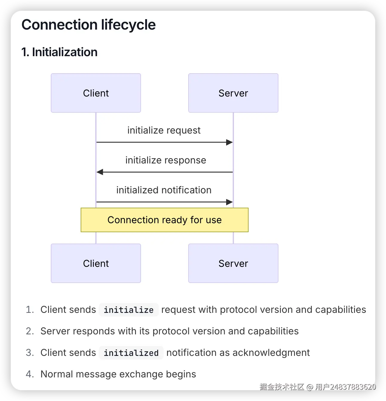 在客户端与服务端的交互过程中,首先由客户端发起初始化请求,服务端则返回初始化响应。在这个阶段,主要传递的内容包括客户端的基本信息(如名称和描述)以及所使用的MCP协议版本。同时,服务端会返回对应的基础信息(如名称和描述)及MCP协议版本。