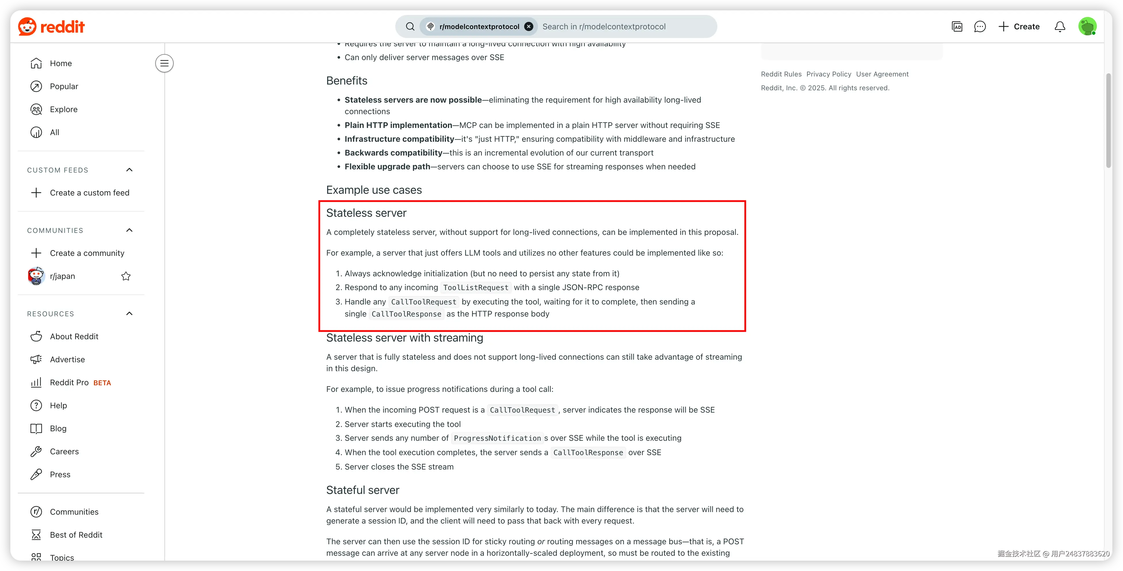 这个目前实践下来发现有一些痛点是工具输出格式未定义。这里MCP协议开发的一些示例服务器基本上都是返回自然语言(可能认为是给模型用的上下文,所以希望都是自然语言),社区目前讨论比较热的方向是对多模态的支持以及一些实际在用工具做产品交互时,比如工具的结果要做一些额外的处理渲染等,没有固定格式很不方便。