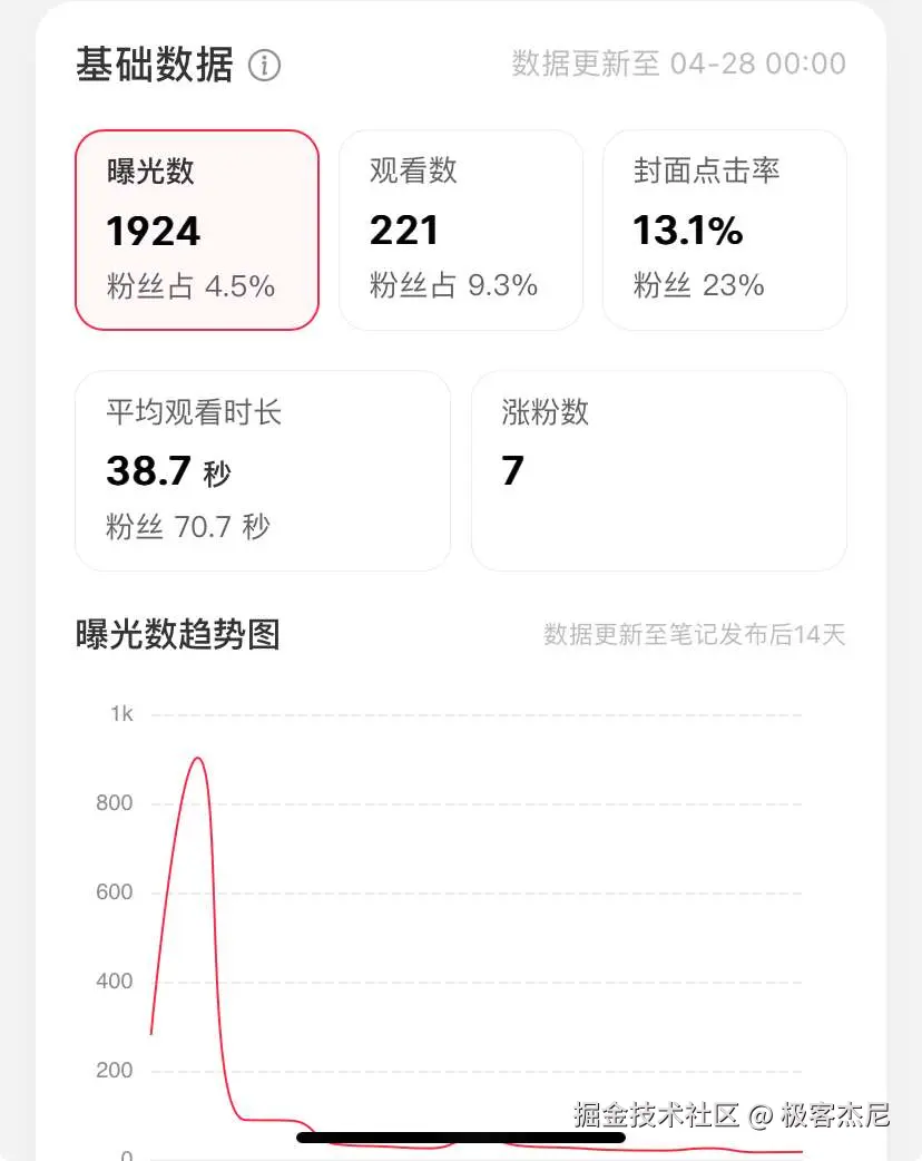 整体数据我认为符合自己的预期,单篇笔记点赞能上 30+,曝光数能达到 2000 左右,首页推荐达到 70% 以上,说明内容质量还是比较不错的。