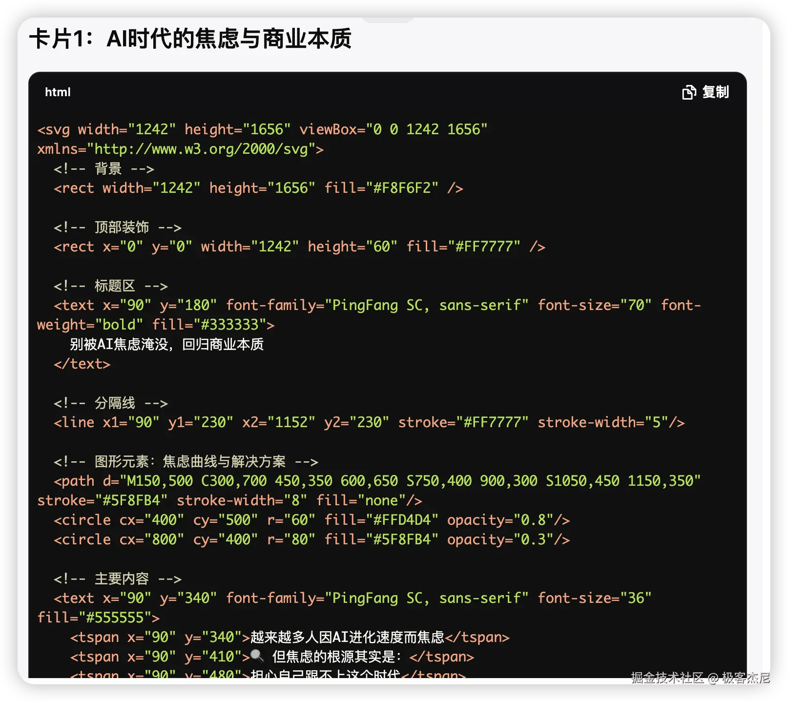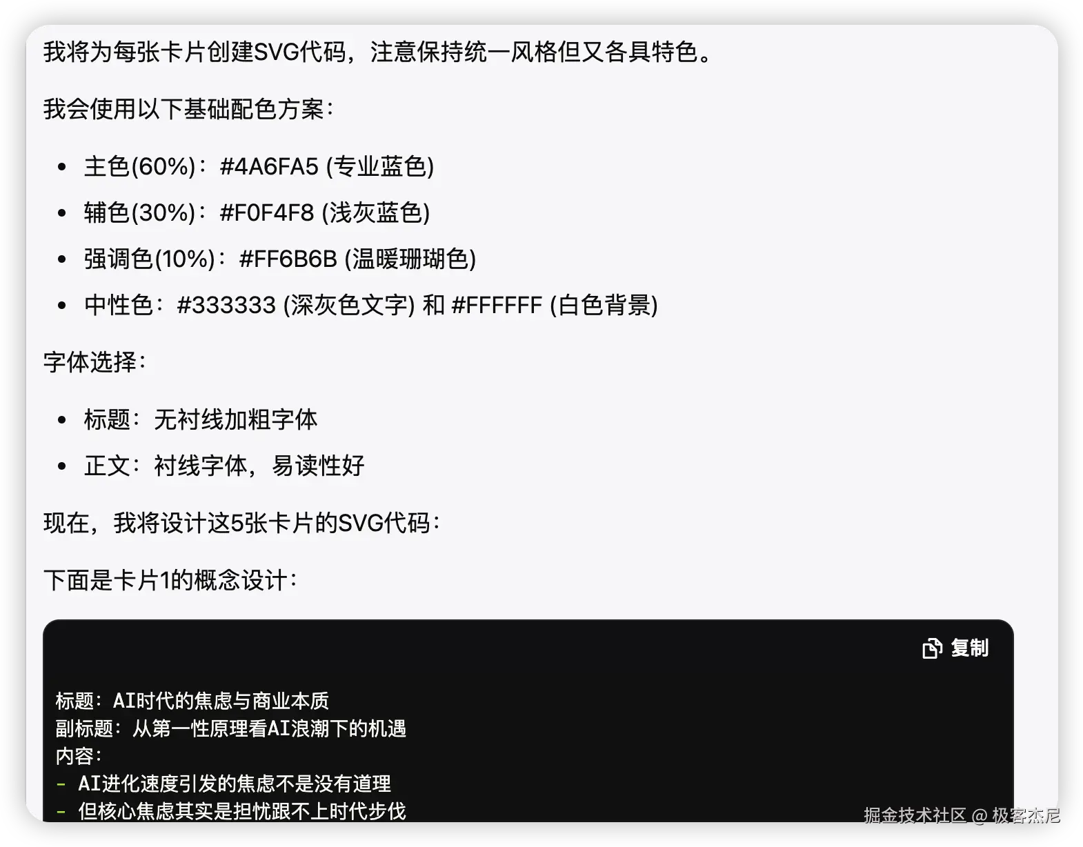 从体验上来说,思考时间比较长,花了 30 秒,包括规划卡片内容,配色方案,概念设计等。生成好的卡片每个代码块都可以快捷复制。