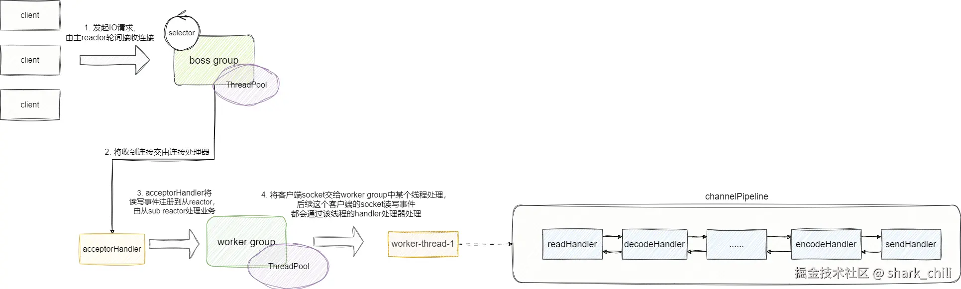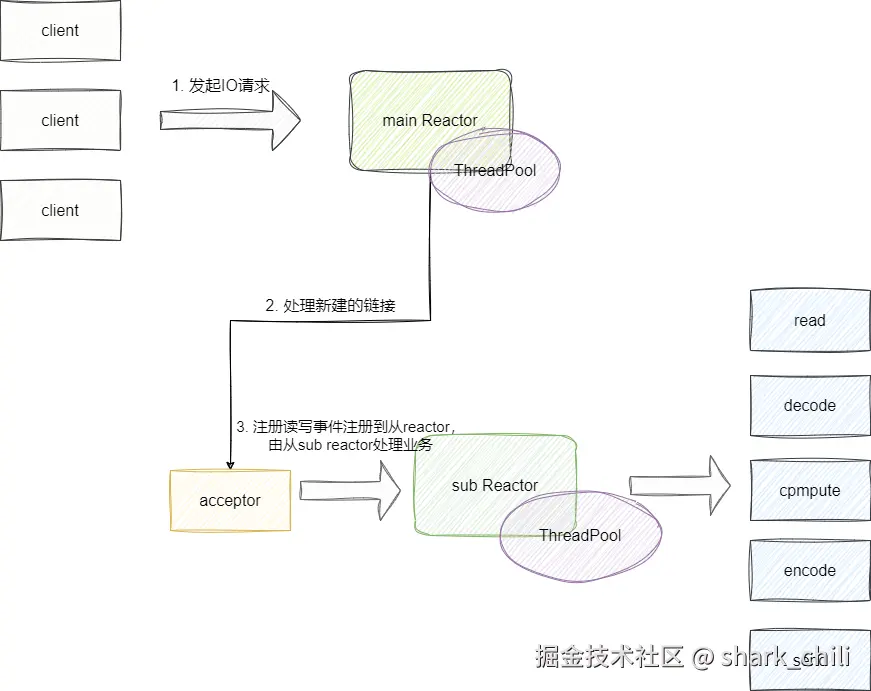 最后就是主从Reactor模型,也就是如今主流的Reactor模型,该模型为用分为主Reactor和从Reactor,各自都是以线程池的形式存在,由主Reactor专门处理连接事件,随后将每个建立连接的客户端socket读写事件注册到从Reactor中,由从Reactor负责处理这些读写以及业务逻辑。 主从Reactor模型是一种改进的事件驱动编程模型,相比于单Reactor单线程模型,它具有以下几个优势: