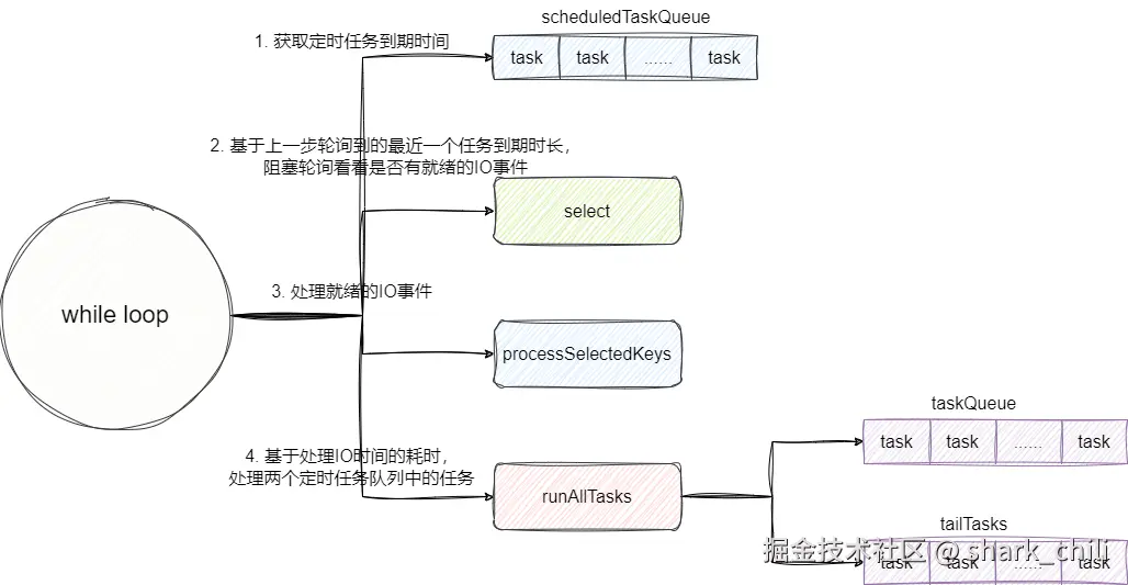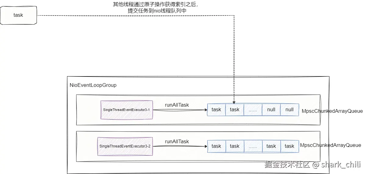 这一点我们可以直接查看NioEventLoopGroup 的构造函数即可看到,初始化时其内部会调用newTaskQueue创建MpscChunkedArrayQueue来管理任务: