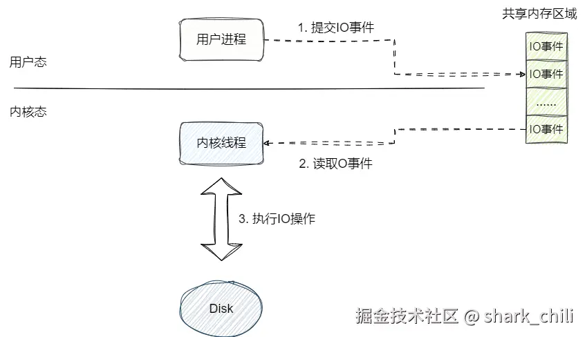 io_uring的提交队列(它是一个环形缓冲区)中追加该事件,用tail指针指向该事件。 - 底层的sq线程轮询提交队列中待完成的事件指针,拿到这个IO事件,发起磁盘IO调用。
