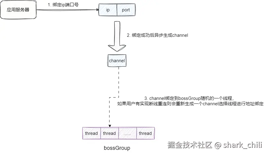 答案是连接失败的情况,一旦绑定ip端口失败,Netty内部会抛出异常,如果服务端有断线重连机制,进行重新绑定时,channel可能会绑定eventGroup中的另一个线程: