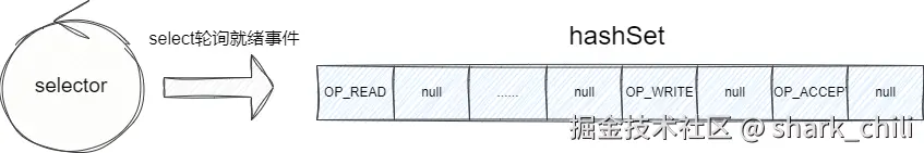 我们不妨看看SelectedSelectionKeySet做了那些优化,首先从定义来看它的SelectionKey是一个数组,很明显数组的添加和遍历效率都是顺序的所以处理效率相较于HashSet会高效需多。而且因为数组内存空间是连续的,可以更好的利用CPU缓存行从而一次性读取并遍历更多的key进行高效处理,所以每次CPU都可以加载对应元素和其邻接元素,所以处理效率相较于不规则的HashSet要高效许多。