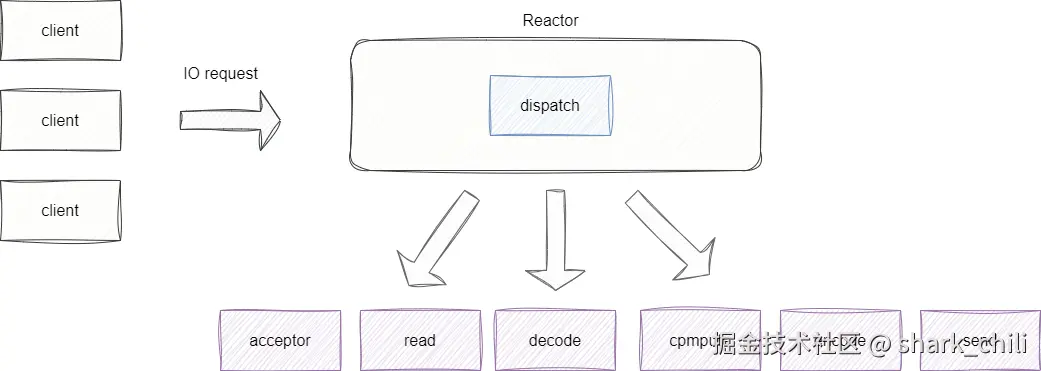 先来说说单Reactor单线程模型,每个客户端与服务端建立连接时,所有的请求建立、读写事件分发都由这个Reactor线程处理。很明显,所有的连接建立、读写和业务逻辑处理等工作都分配到一个线程上,对于现如今多核的服务器场景,这种方案未能很好的利用CPU资源,对应高并发场景表现也不算特别出色(会比传统的BIO好一些):