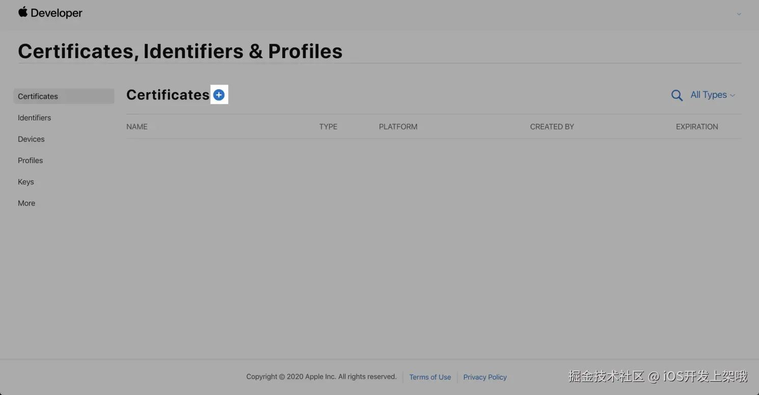 - 打开 Certificates, Identifiers & Profile 页面,选择 Certificates,单击 + 。