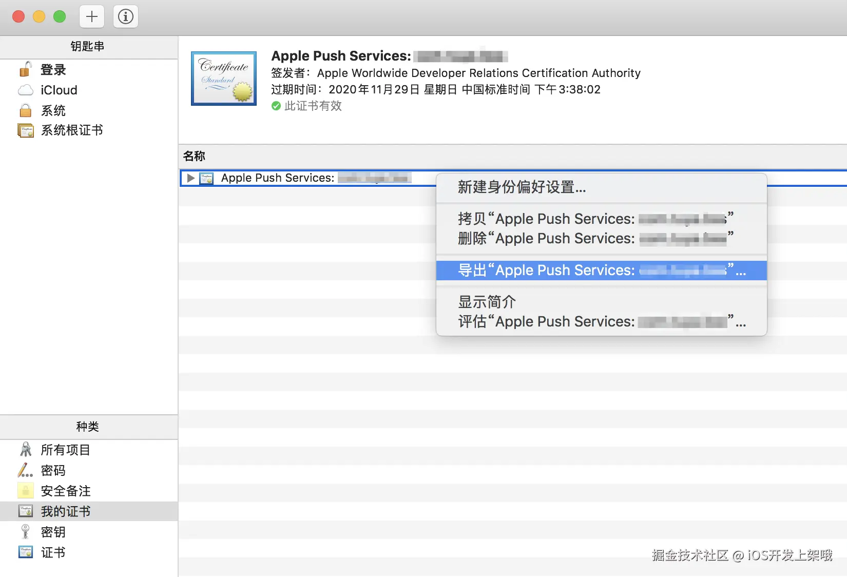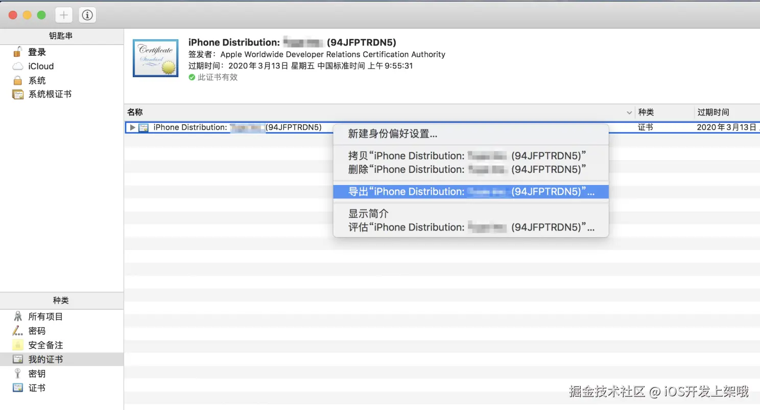 - 打开 钥匙串访问 应用,在 种类 栏目选择 我的证书,找到导入的证书,右键选择 导出证书。