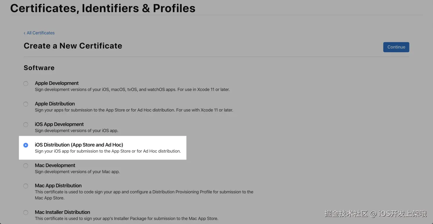 - 选择 iOS Distribution ( App Store and Ad Hoc ) ,单击 Continue。