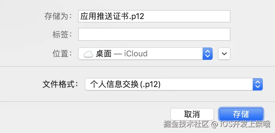 - 存储为 应用推送证书 .p12 (名称您可以自定义) ,文件格式选择 个人信息交换 (.p12) ,单击 存储。