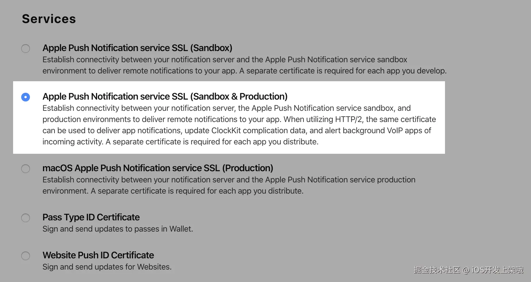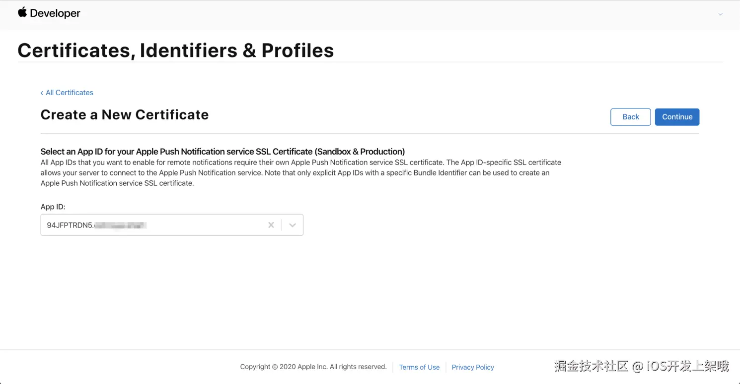 - 选择 Apple Push Notification service SSL (Sandbox & Production) ,单击 Continue。