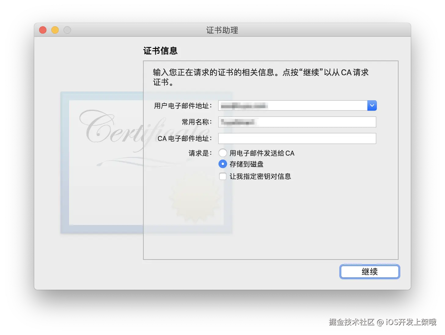 - 用户电子邮件地址 填写您的常用邮箱,常用名称 填写您的名称,选择 存储到磁盘,然后单击 继续。