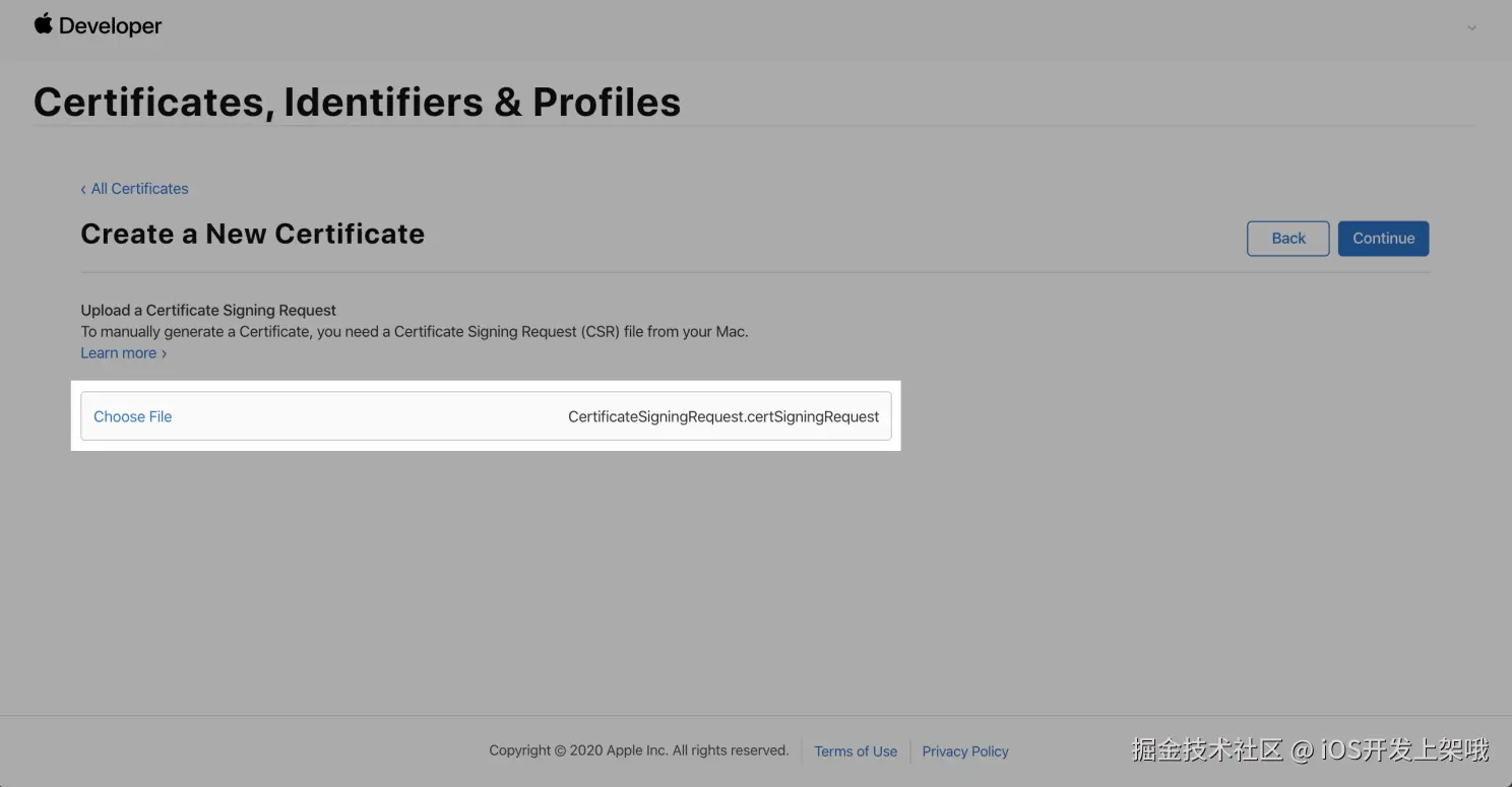 - 在苹果开发者平台上传 CSR 文件并下载苹果颁发的证书到本地。
