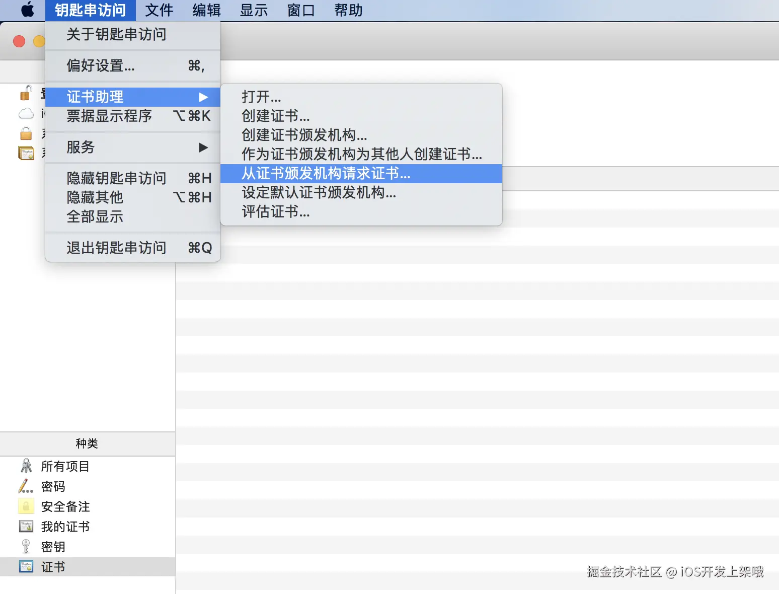 - 在 钥匙串访问 应用程序中,单击菜单栏 钥匙串访问 > 证书管理 > 从证书颁发机构请求证书。