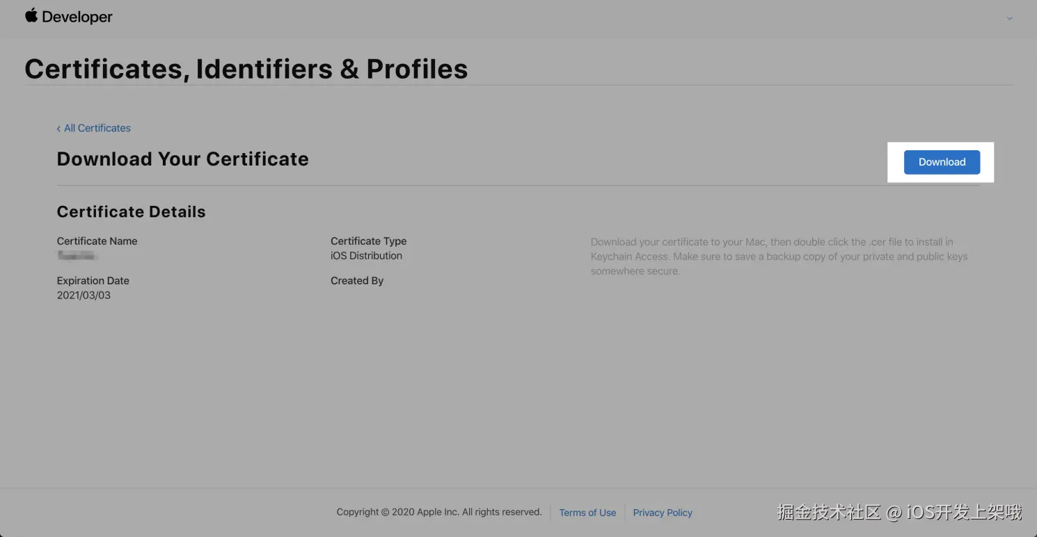- 单击 Download,下载 ios_distribution.cer 文件到本地