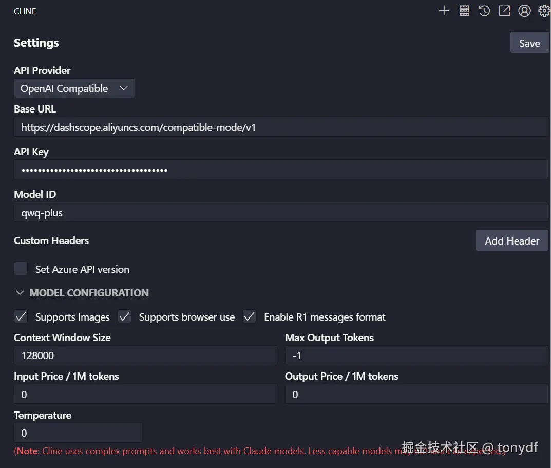 在Cline中配置一个有Function Call能力的模型,我这里使用的是Qwen系列,说起来,Qwen最近新发布的Qwen3开源模型已经原生支持MCP了,相当炸裂。