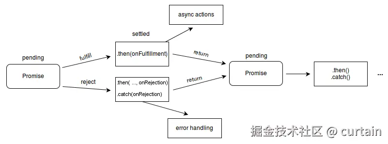一个待定的 Promise 最终状态可以是已兑现并返回一个值,或者是已拒绝并返回一个原因(错误)。当其中任意一种情况发生时,通过 Promise 的 then 方法串联的处理程序将被调用。如果绑定相应处理程序时 Promise 已经兑现或拒绝,这处理程序将被立即调用,因此在异步操作完成和绑定处理程序之间不存在竞态条件。