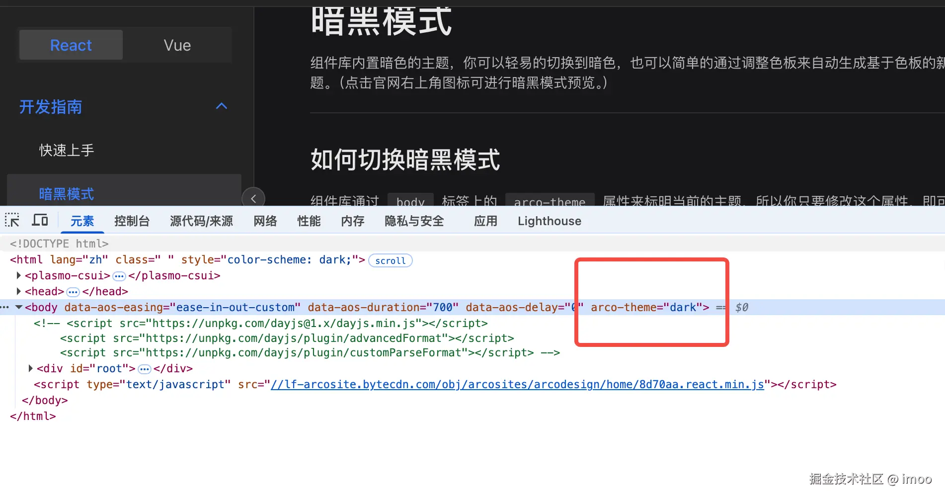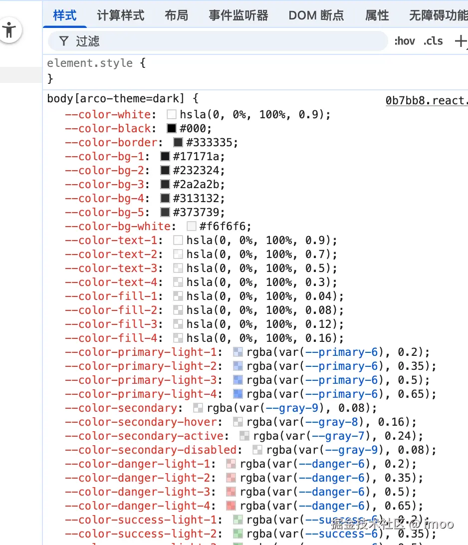 很简单,直接去操控 arco-theme 这个属性的值,如果为 dark 就为暗色,那么就上项目里看看这个值