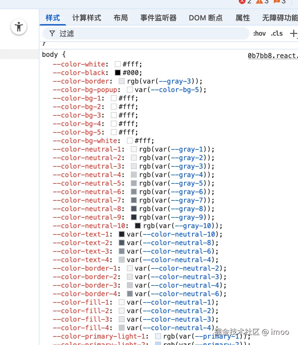如图所示,还是比较简单好懂的。arco design 做的事情基本就是如此,它定义了相当丰富的变量,所有的颜色几乎都可以在变量中找到。在组件库中,只需要全部颜色相关的 css 都使用 body 中的变量,就可以达成一键切换的效果。