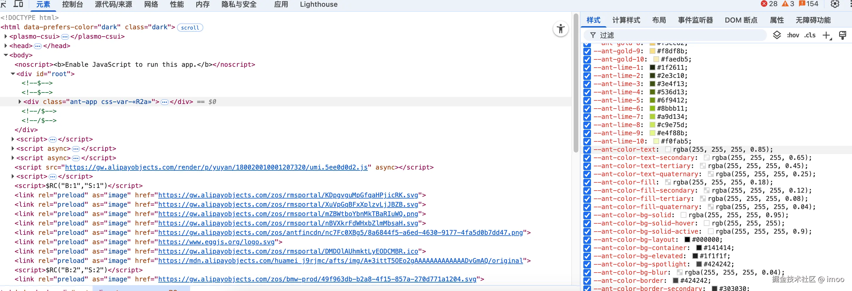 果然,这里增加了一个属性,但为什么增加一个属性就可以起到切换主题色的作用呢?再把目光切到右边,亮色模式时: