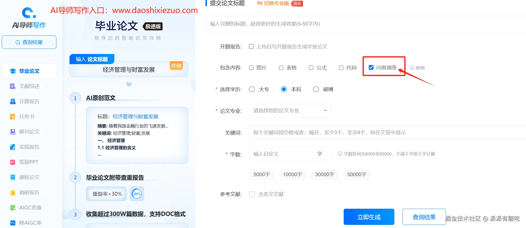 现在偷偷告诉你,使用“AI导师写作”生成毕业论文或期刊论文时。 只要你的论文适合使用问卷调查,勾选问卷调查,就能在论文生成的最后部分,附上一份符合你研究方向的专业问卷,从问题设计到数据分析思路全都有了。还等什么,这么好用的方法,赶快get起来吧!