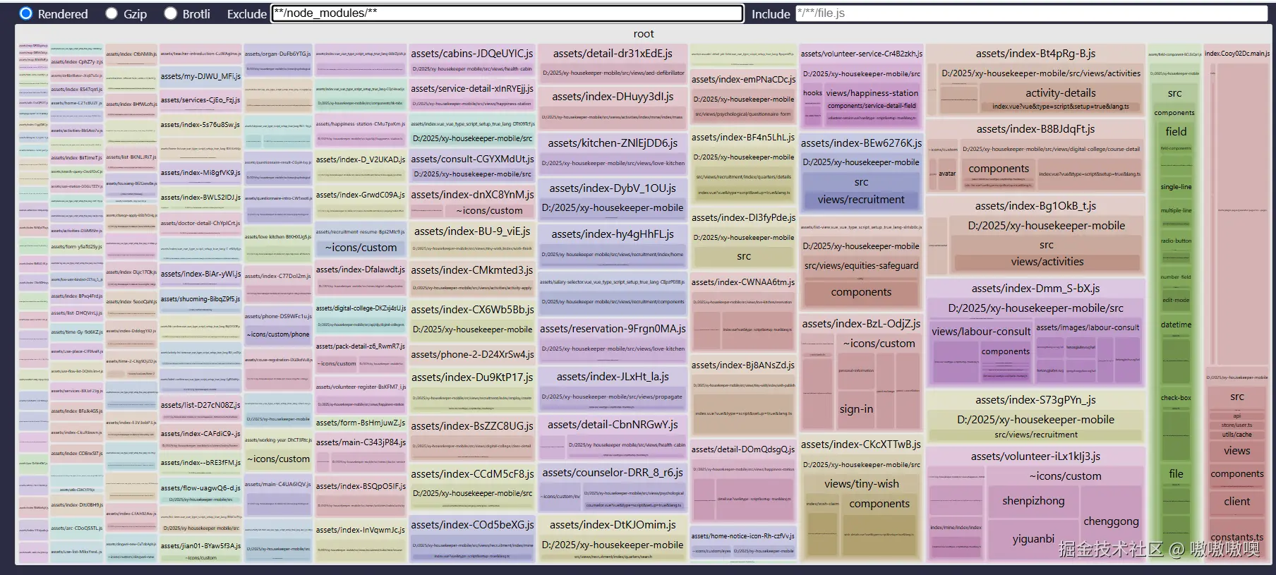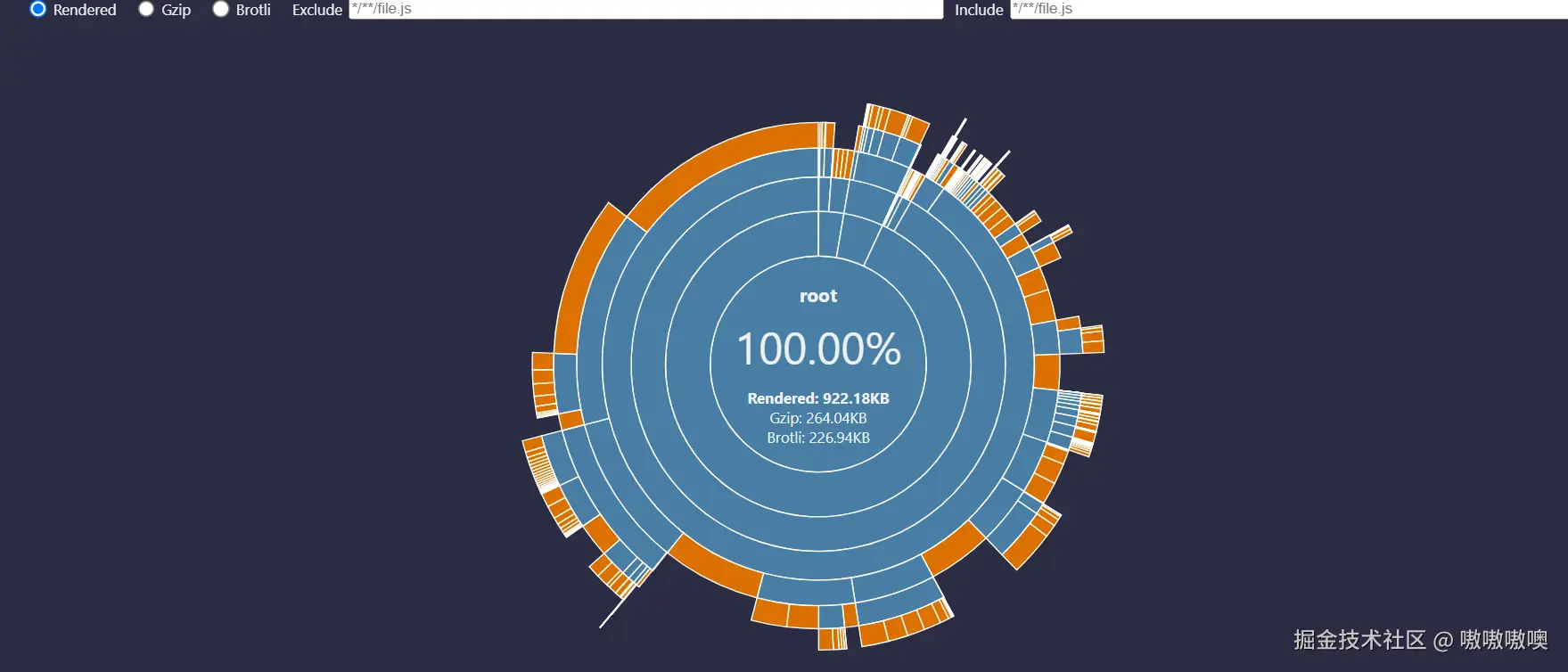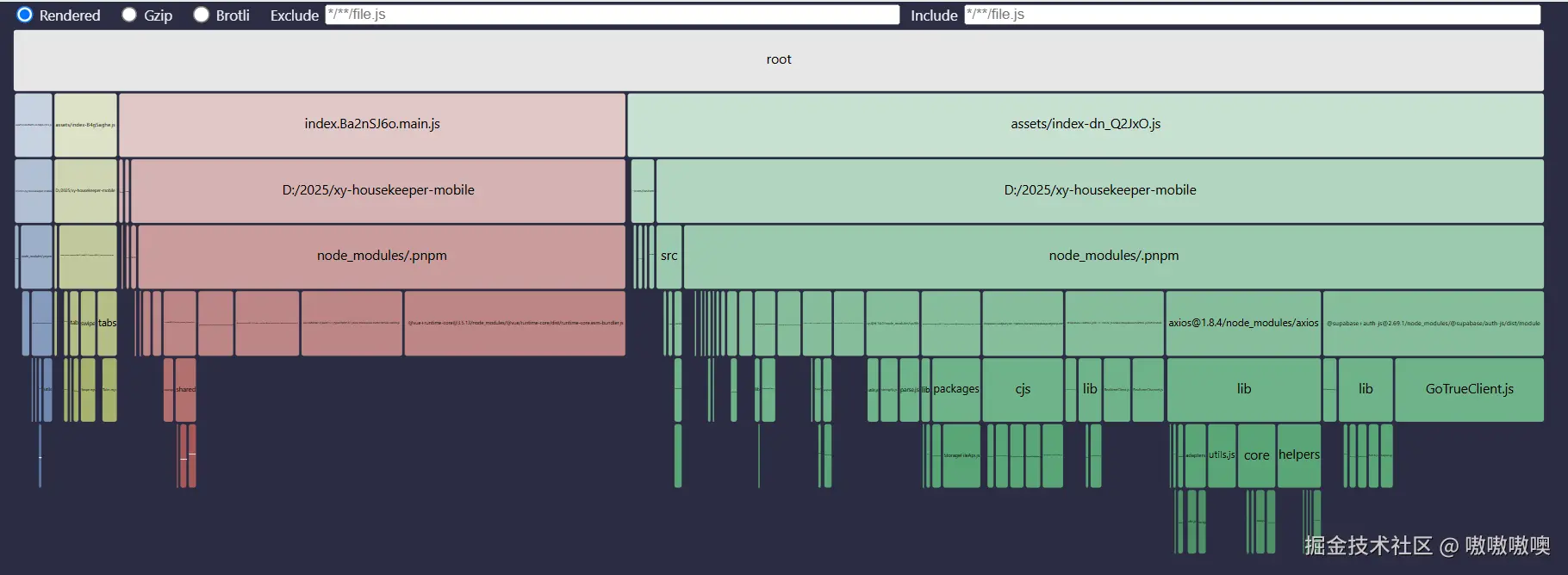 可以在 Exclude 筛选框排除不需要查看的文件,在 Include 筛选框输入需要查看的文件,注意这里的文件不是打包后的文件,而是项目原始文件路径,满足 picomatch