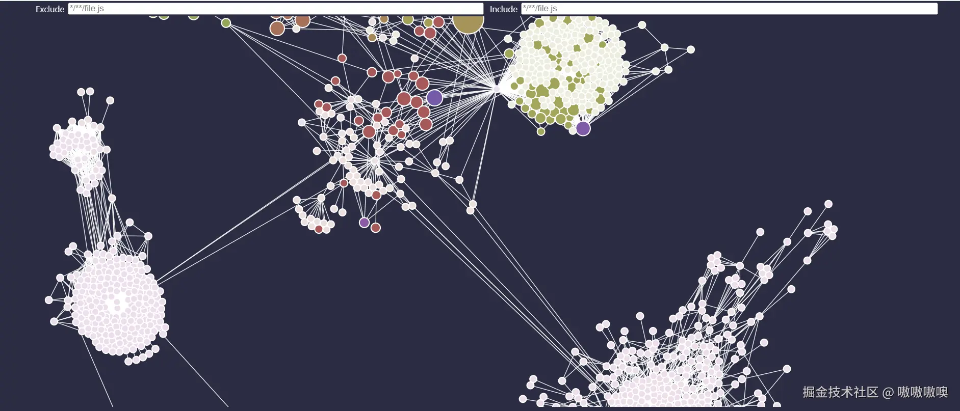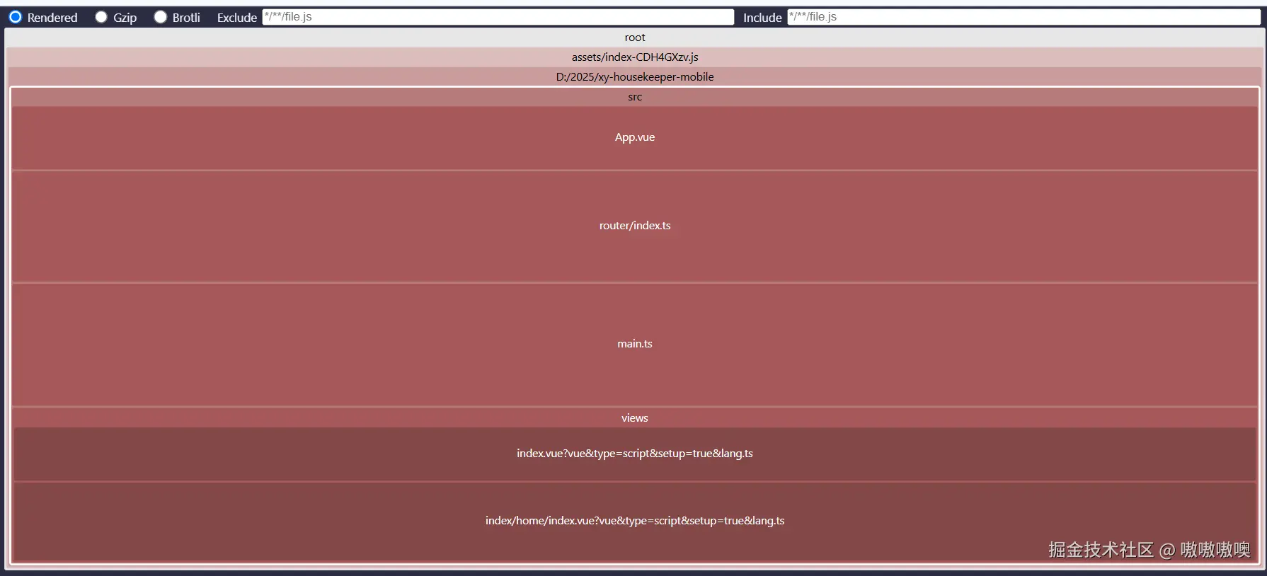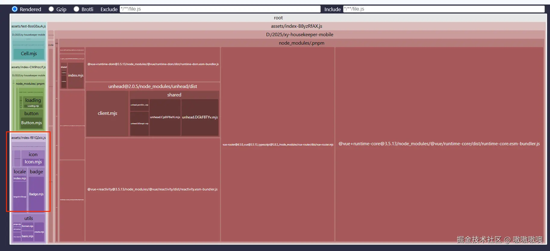 可以在 Exclude 筛选框排除不需要查看的文件,在 Include 筛选框输入需要查看的文件,注意这里的文件不是打包后的文件,而是项目原始文件路径,满足 picomatch