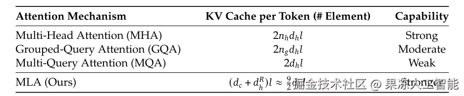 下面这个表格对比了每个 token 的 KV 缓存大小和建模能力,在 MHA、GQA、MQA 和 MLA 之间,突出展示了 MLA 是怎么在内存效率和表达能力之间取得更好平衡的。