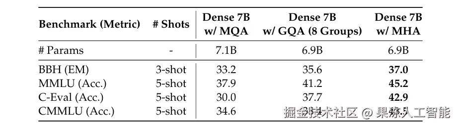 更具体地说,下面这个表格给出了在 7B 规模模型下,MHA、GQA 和 MQA 的表现数据,