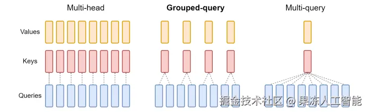 图 3. MHA [6]、GQA [10] 和 MQA [9],图片来自 [10]。