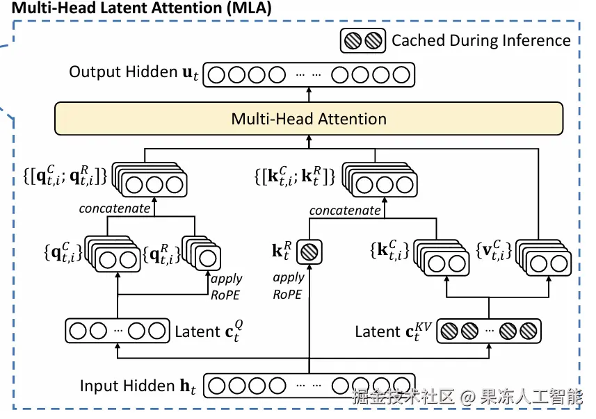 完整的 Multi-head Latent Attention(MLA)过程如下图总结(公式编号对应 [3] 的附录 C):