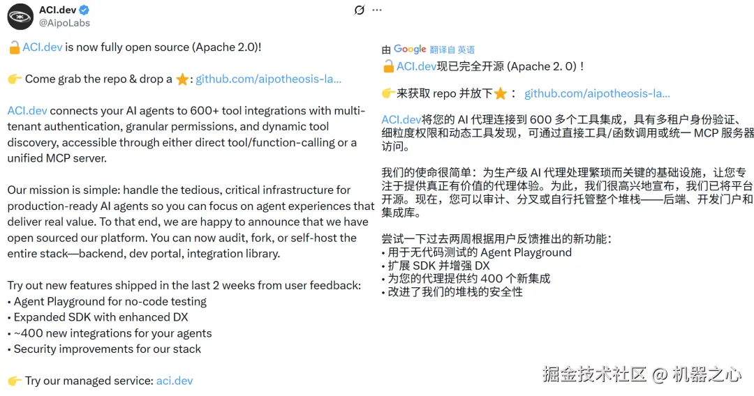 ACI.dev 选择了全开源(Apache 2.0),让开发者能: