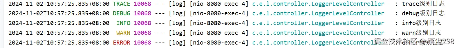 运行之后发现 debug 级别和 trace 级别的日志没有打印出来,这是因为默认配置的日志级别是 info 级别的,所以比 info 级别低的就打印不出来