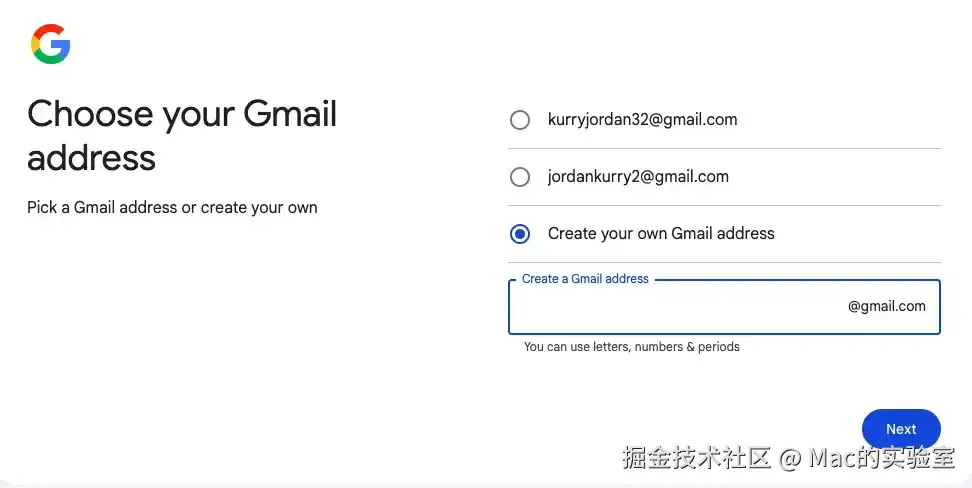 ⑤ 它会推荐你两个备选的邮箱名称,或者点击**「Create you own Gmail address」**自己创建一个专属的名称。