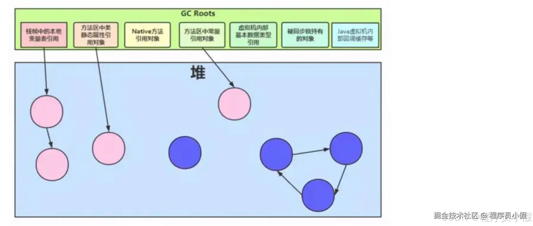 参数、局部变量、临时变量等在方法区中类静态属性引用的对象,譬如Java类的引用类型静态变量。 -
