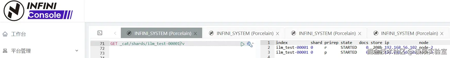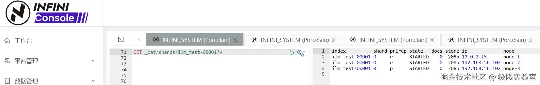 又 7 分钟后(距索引创建 10 分钟),18 点 00 分 46 秒,索引进入 cold 阶段,副本数变成 0,只剩下一个主分片。