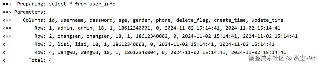 @Select("select id, username, password, age, gender, phone, delete_flag, create_time, update_time from user_info")