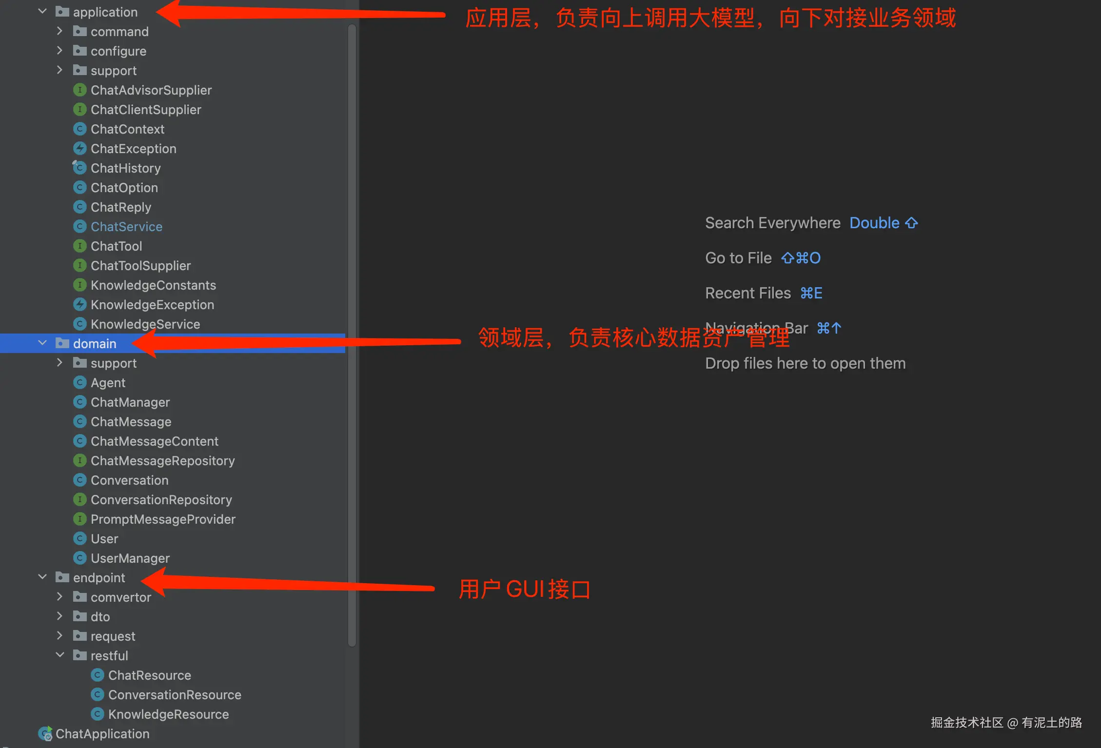 我们会简单的模拟豆包的业务模型,开发一个用户与大模型对话的应用程序,我们会从领域模型开始设计,一直到应用模型和应用实现。