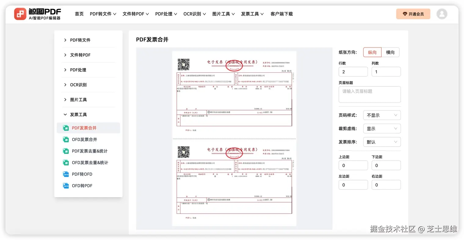 在日常财务管理中,合并多张发票并打印是一项常见需求。鲸图PDF 的 发票合并功能 为您提供了一种高效、灵活的解决方案。通过丰富的参数设置,您可以轻松实现多张发票的合并与打印,满足个性化需求。以下是详细的功能介绍及使用说明。