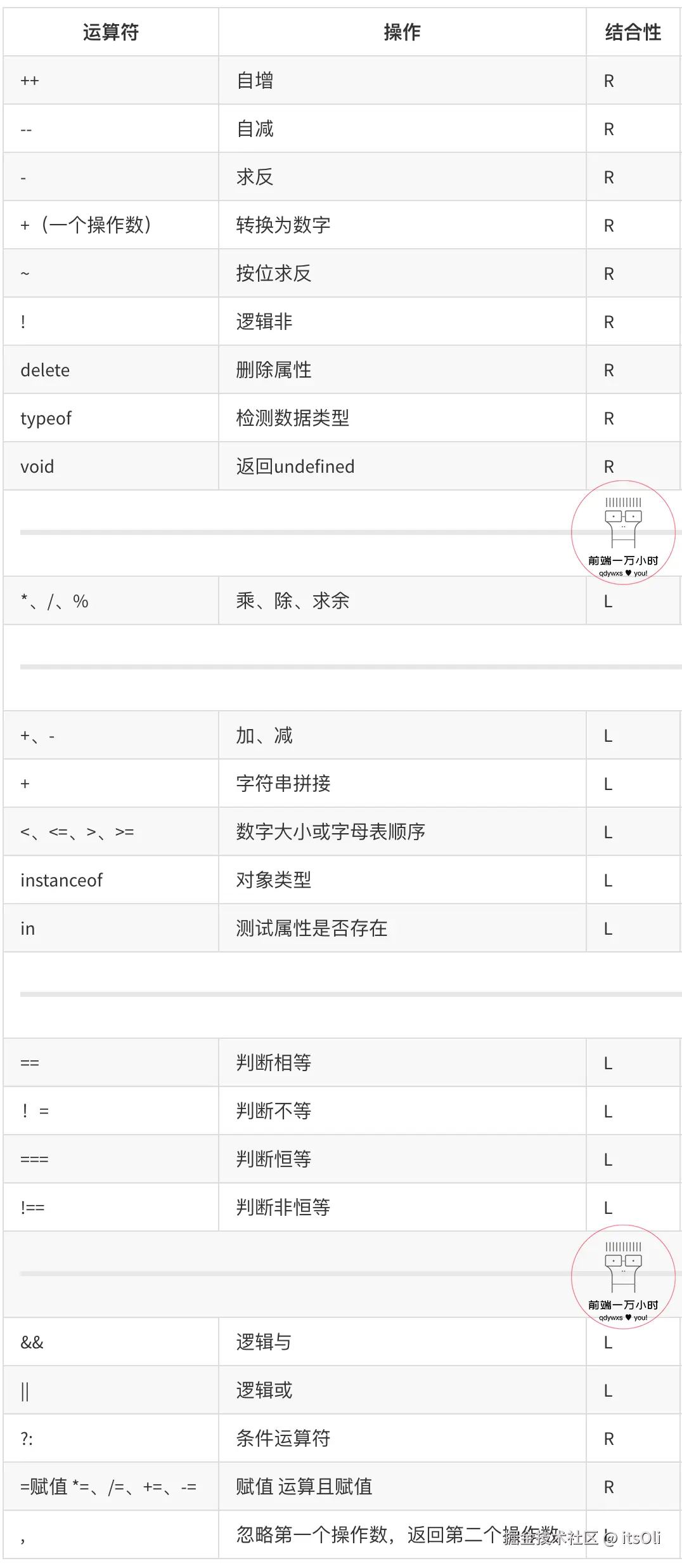 🏆 以下表格取自《JavaScript 权威指南》,从上到下表示运算符的“优先级”。R/L 代表相同优先级运算符的“结合性”是“右结合”还是“左结合”: