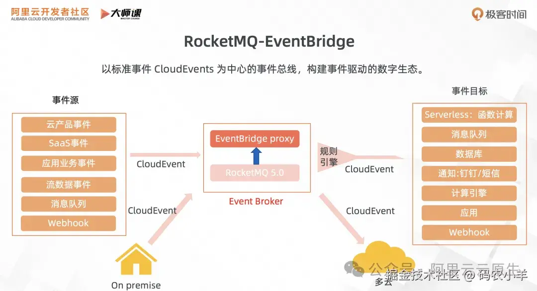 下图是 RocketMQ 面向 EDA 场景全新推出的产品形态 EventBridge。它的核心技术都是基于 RocketMQ,但是在产品界面上面向事件驱动的业务进行一层抽象,核心领域对象从消息变成 CloudEvents。基于统一事件标准来构建事件驱动的数字生态。