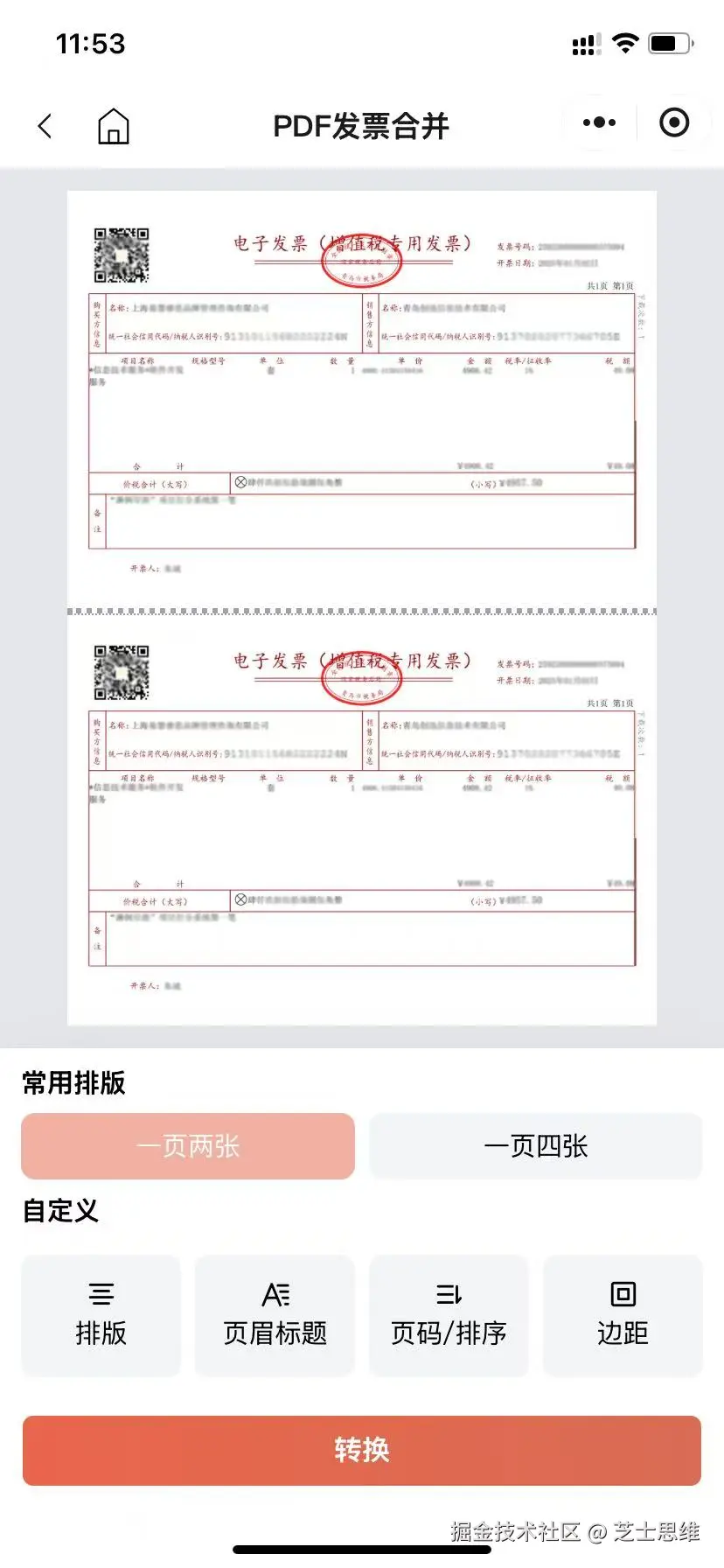 - 将多张发票合并到一页