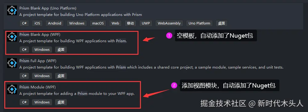 安装拓展包后,可以选用空模板创建,默认是. netCore 的,Prism 包也是 8.1.97 版本的