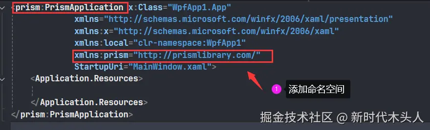 修改 App.xaml 文件, 添加 prism 命名空间, 继承由 Application->PrismApplication, 如下所示: